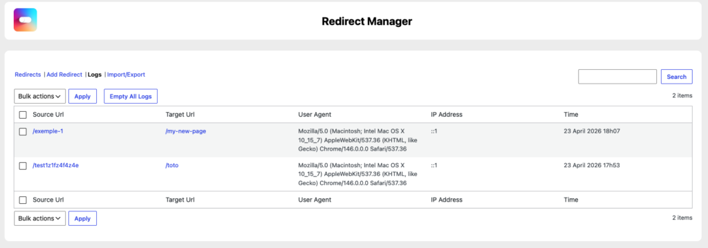 Cada vez que se ejecuta una redirección en modo WordPress (PHP), puede registrar :